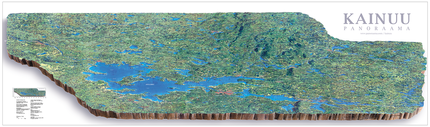 Kainuu panoraama on valmistettu maanmittauslaitoksen kartta-aineiston perusteella kynäruiskulla. Juliste on erittäin korkeatasoisesti painettu, joten siitä voi nähdä useimmat rakennuksetkin.